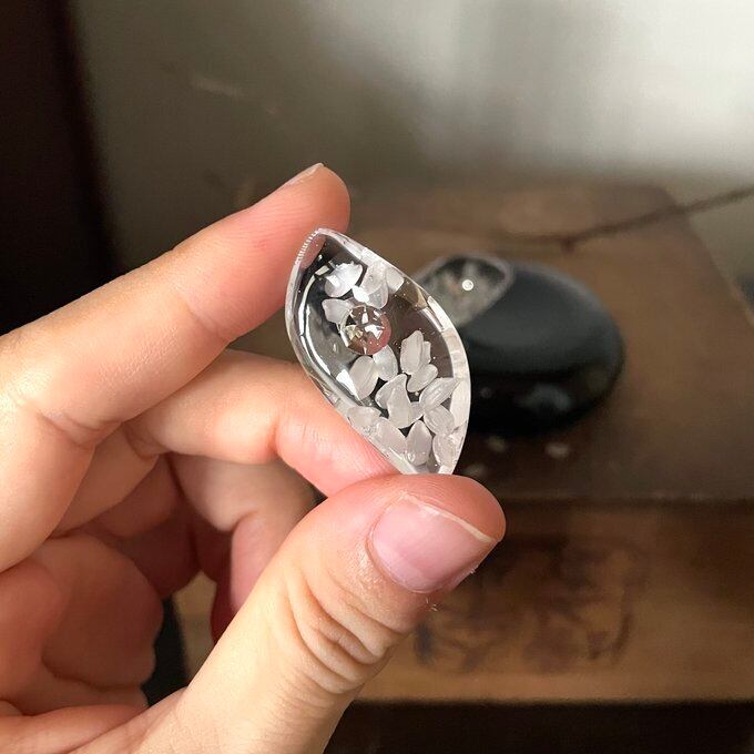 天候や使用モニターなどにより写真と実物の見え方に差が出る場合がございます。レジンの気泡は美しさの要素と考え残しています。