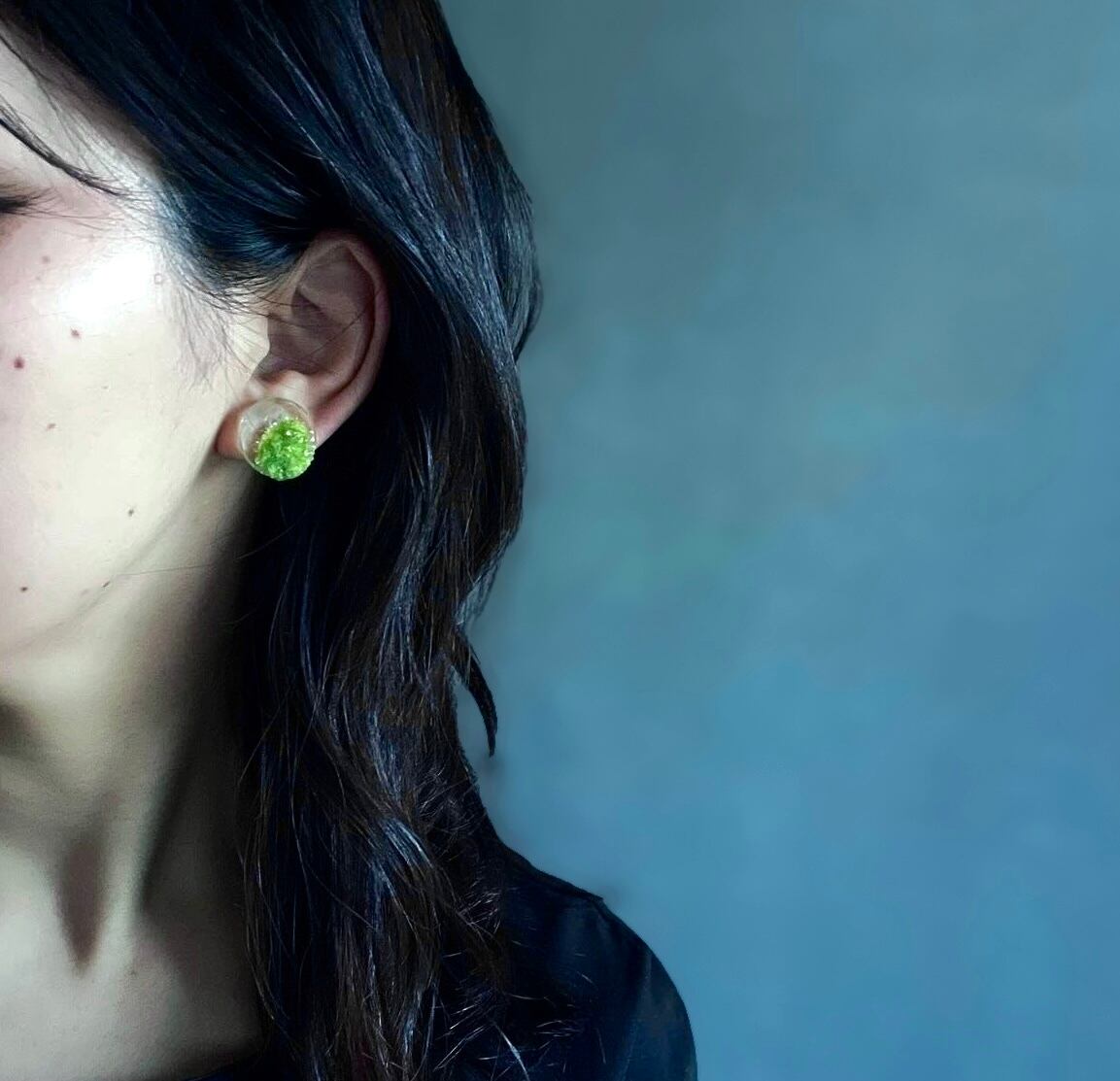透明土台に点在する明るい黄緑の苔が美しいピアス。